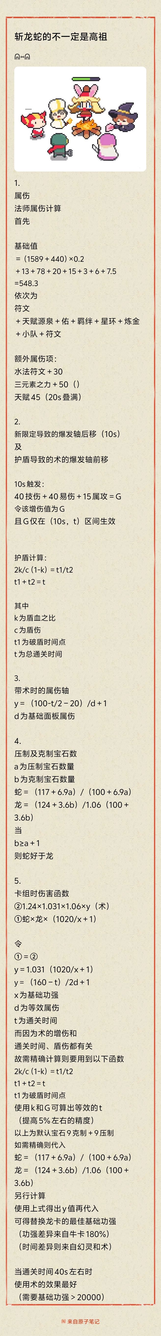 使用术+銃替换龙+蛇+牛结论当通关时间40s左右使用术的效果最好(需要基础功强>20000)需要根据自身面板代入数据正文详细解明了论证过程并附公式新帖考虑了1.法师叠层时间2.术伤害衰减3.幻灵10s启动4.毕业宝石数量差异5.盾伤对整体轴的影响等问题在数据上也打了补丁是对上一篇帖子的补充(对本篇攻略的大部分质疑都能在正文中找到解答,像我说的,完整阅读700字