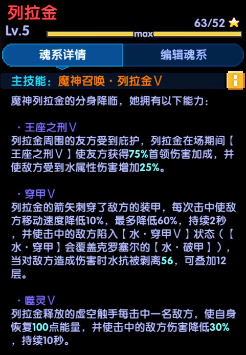 列拉金魂系的魂力技能持续10秒钟,cd为60秒其具体的技能效果具体可以理解为(均算):12.5%首领伤害,4.166%水易伤,672削抗而列拉金魂珠的特色是6%水伤需要2个即12%水伤,且通用魂珠效果就比较弱了,大致相当于均算4%水伤综上来说,对比于克洛塞尔魂系总加成如下:我们带入一下标准模板来看可以看的出来列拉金大概强于克罗赛尔5%左右,并且还多了一个基础魂珠的位置我们在代入海游看