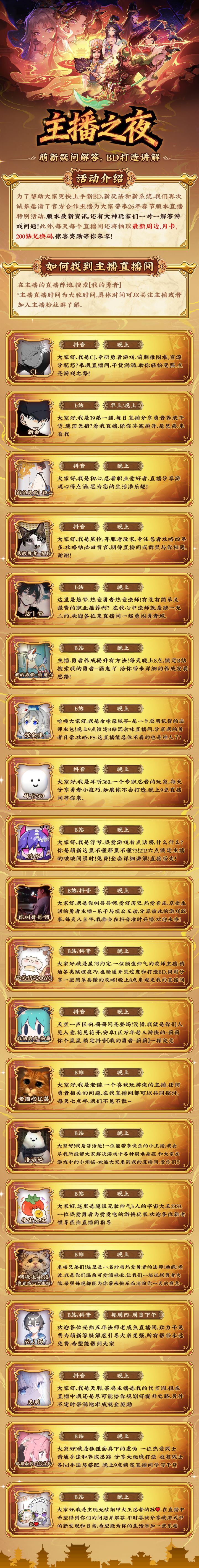 大家好~你是否是刚入坑的新手,对勇者的养成体系还一头雾水?或者是老玩家在新版本上线后-苦于不知道该怎么高效搭配“三国名将”的BD?-担心交易踩坑?-新刷法不知道怎么高性价比的刷?-不知道新暗金和老暗金怎么搭配,能让伤害最大化无论是新手还是老玩家,这次春节版本的特别活动——【主播之夜】都能为你带来满满惊喜!在这场直播活动中,不仅有全新版本的内容详解,还有机会与官方主播亲密互动,轻松答