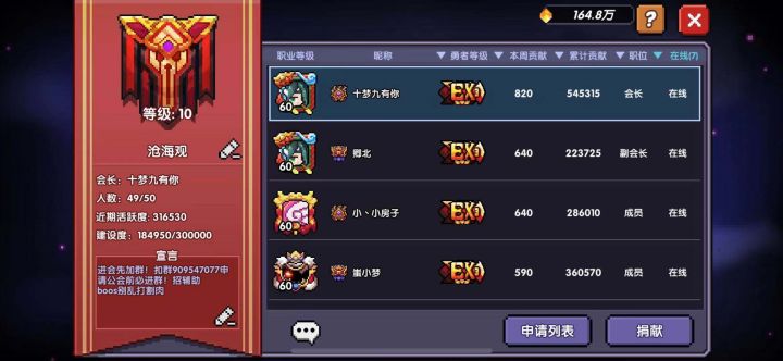 十级沧海观招人~木系版本已经上线,萌新、大佬 走走留留。努力做一个有人情味的公会。需要你的加入:每周固定团本,每天固定裂隙BOSS,探险割肉。如果你恰好也在ios5\6。期待你的加入,一起报团取暖呀~Q群:909547077