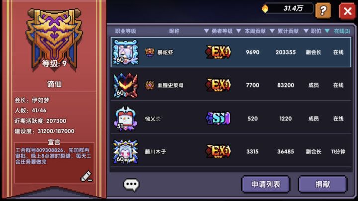 只求活跃度 秒伤多数10e 最高60e萌新大佬都欢迎 只要每天做工会任务 深渊探险 开裂隙的时候在群里喊可以上线即可 晚上固定时间带打团本 先加群再申请 群号809308826