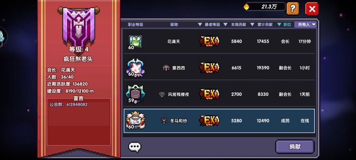 为了公会能日益壮大,勤勤恳恳的会长又来招人了。如果你是刚入坑的萌新,回游的老玩家亦或是想变强的潜力股,都可以来安卓一区“羲和”公会。如果你有打不过的混沌地牢或是想打资源团本也可以来本公会,副会长也是可以任劳任怨的带大家的。所以不要犹豫直接搜索羲和公会加入我们吧!#我的勇者