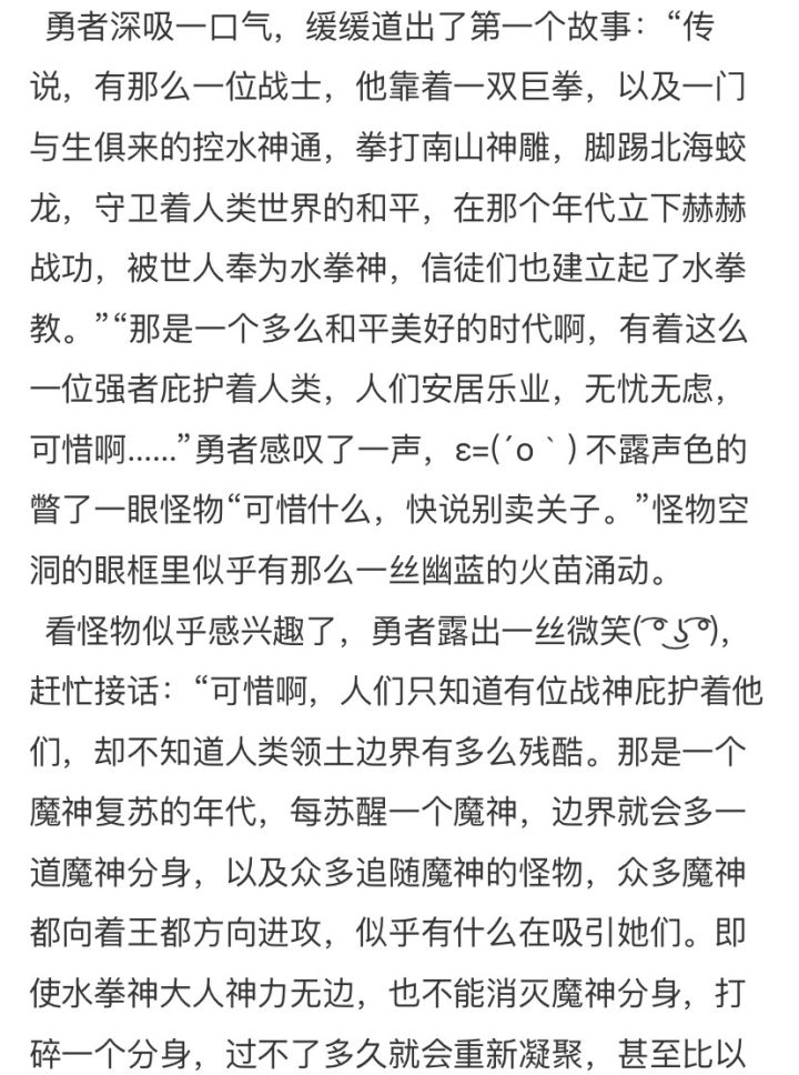 我想如果是邋遢老头遇到的邪神,夕拾里或许又多一篇佳作。我看到“对邪神讲故事”这个主题,脑海里一下子就蹦出来这篇有关树人的故事。我看完后曾发誓绝不让生命里再多一个遗憾,可生活总是事与愿违...许多东西也像折磨树人一样折磨着我。我本想用自己的话把这个故事讲出来,也多一些关于“我的勇者”味的内容,但我思考了两个晚上,废稿扔了三次也表达不出这种宏大又细腻的感觉...最后我想,干脆全都抄下来吧。或许有些自私