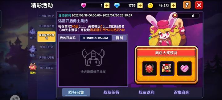 《我的勇者》捣蛋魔女佛拉丝隆重登场,全新时装,炫酷机甲,等你体验~回归玩家可在(精彩活动-战友的回归召唤页签)填写召集邀请码还可领取专属礼包: 5FLM56JYDN5RXV 各位大佬求求了