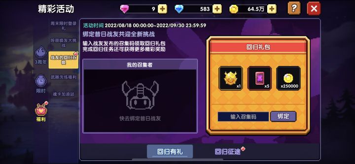 《我的勇者》三周年庆典火热上映中,大量福利等你来领~回归玩家可在(精彩活动-战友的回归召唤页签)填写召集邀请码还可领取专属礼包: 5FK9ACKEMQACG7
