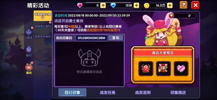 回归的大哥,我需要你们!《我的勇者》捣蛋魔女佛拉丝隆重登场,全新时装,炫酷机甲,等你体验~回归玩家可在(精彩活动-战友的回归召唤页签)填写召集邀请码还可领取专属礼包: 5FLGSRS53RRCT9