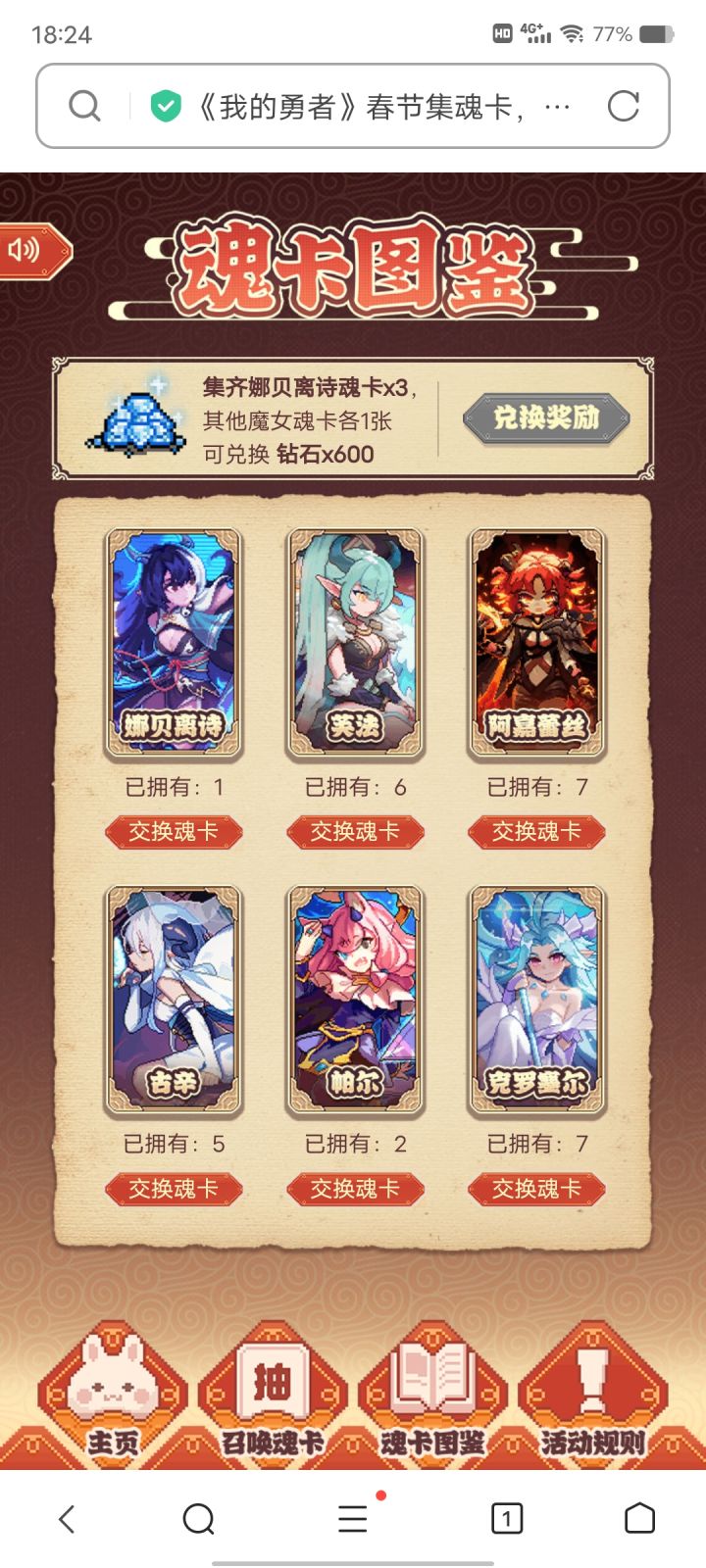 《我的勇者》春节集魂卡,娜贝离诗给你送钻石!我想用阿嘉蕾丝魂卡与你交换娜贝离诗魂卡,https://www.r2games.com.cn/act/card2023/6473551217?exchangeToken=PJbkDCvAUreVNvlCAHcI