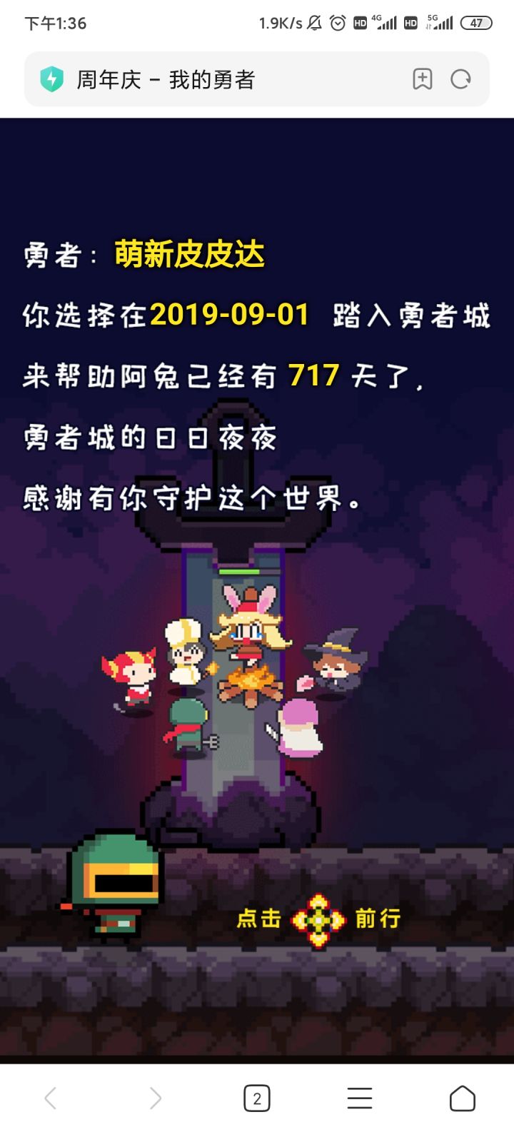二周年咯,2019年8月22日至今,经历过风风雨雨,现在勇者2.0正式启动,新的旅程也已开启,希望勇者玩家越来越多,把把都爆红宝石,魂卡成成成!也希望勇者🐸越来越好