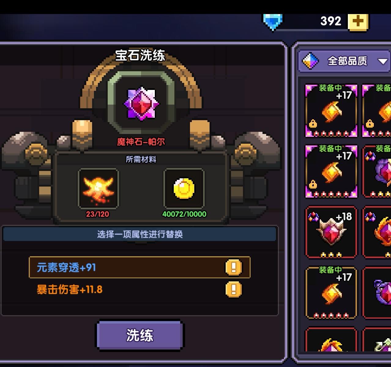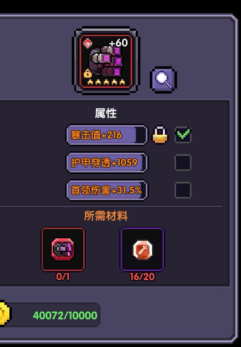 建议出个锁定属性洗练宝石太难洗了真的没次都不一样,紫色元素穿透也行啊武器还是希望能出个锁定属性,最主要宝石太浪费材料了我把我肝割了都洗不出来😁