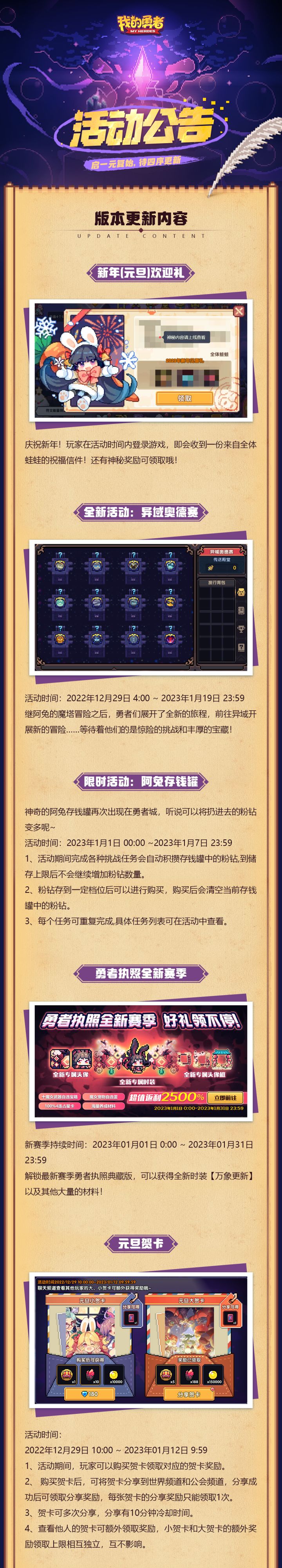 大大们好,目前用手机端Taptap app查看文章可能会出现机型不适配排版乱掉的问题已经联系taptap人员解决成功啦~大家可以正常查看该文章了!更新维护流程 ⏰服务器维护时间:2023年1月16日 上午 8:00~12:00(预计4个小时)停服更新🎁维护补偿:黄金武器币x3神秘技能币x3钻石x100 邮件有效期为5日,烦请各位勇者合理安排上线时间,以避免造成损失。🥕阿兔送惊