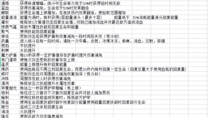 以下内容大概率不全,如有疏漏请带具体效果截图发在评论,感谢指正,接下来我会继续统计和研究,做出更全面的表格和各方面特性推荐以下对特性进行分类我个人暂时将这些特性分类为回复类buff类防御类——————回复类1生命漂流2放血疗法3便当4红光5能量源流6绿茵气韵7聚气8蕴灵9缓药10炼金11破竹12潜伏13英姿—————buff类1蓝血2蝉联3藏针4药囊