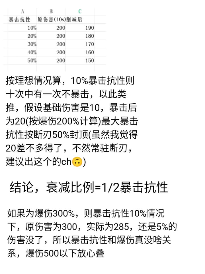 先说暴击抗性吧,云一下,做了个图暴击抗性就是断刃,如果真的到了断刃的比例,那我只能说你萌死了,蛙蛙,另外本身暴击肯定要合格,不然爆伤没意义(这个就不说了,玩这么久都知道)——————————————————————————然后是关于元素穿透和属攻的宿舍,除了新套装,只有魔女安朵斯魂卡提供元素穿透。借用凌宸和子藏的帖子/数据所以,安朵斯魂卡无脑上,饰品卡单属攻就好了,然后问题就来了,有些职业