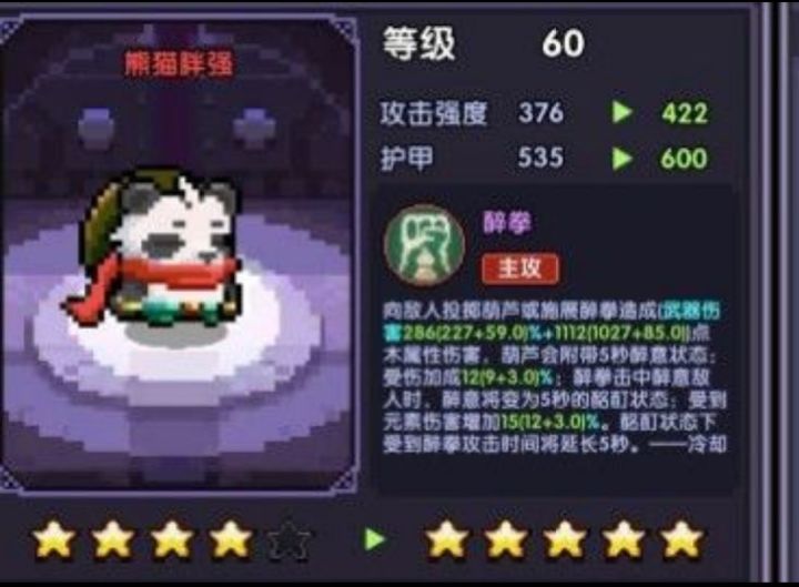 大家好,我是游仙门的小ig。(五星效果镇贴)一、强度分析根据描述,熊猫胖强能够给目标BOSS上两种buff,易伤与元素易伤,经过本人测试,单只熊猫的两种buff不能共存,熊猫有两种攻击方式,即葫芦与醉拳,分别提供醉意和酩酊状态。为了方便描述,上面的醉意和酩酊我用1,2来表示三种情况。情况一:熊猫开局出醉拳。经过测试,并不能给目标上buff,必须要出葫芦才能有buff。情况二:熊猫开局出葫