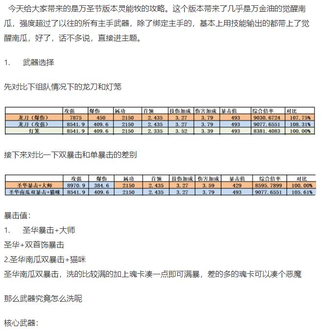 首先感谢一手星怜 本来头疼新BD咋整 要不要弄日刃星群 要不要弄一手大暴击符文 突然被星怜叫出来讨论这破鞋子 发现可行 之后实测了一下觉得挺爽的 今天就试试了 效果拔群 打现在的世界BOSS比旧BD多出了15-30%的伤害吧大概【武器】海德拉 木忍必带核心武器属性选择 首伤、木攻、爆伤.南瓜 目前版本中还是老大哥的存在.属性选择 首伤、穿透、暴击值、觉醒攻强.龙刀 卡后台叠30层懂的都