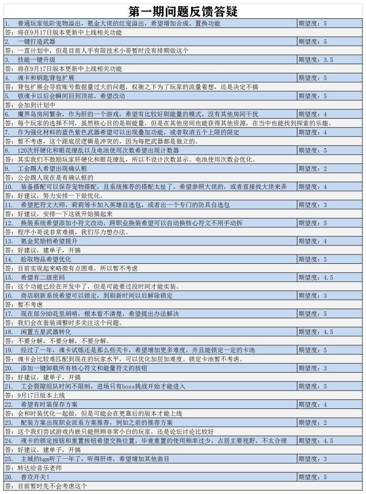 1. 普通玩家低阶宠物溢出,氪金大佬的红宠溢出,希望增加合成、置换功能答:将在9月17日版本更新中上线相关功能2. 一键打造武器答:一直计划中,但是目前人手有限技术小哥暂时没有排期做这个3. 技能一键升级答:将在9月17日版本更新中上线相关功能4. 魂卡和钥匙背包扩展答:背包扩展会导致账号数据量过大的问题,权衡之下为了玩家的流量着想,还是决定不搞5. 锁魂卡以后会瞬间回到顶部,希望