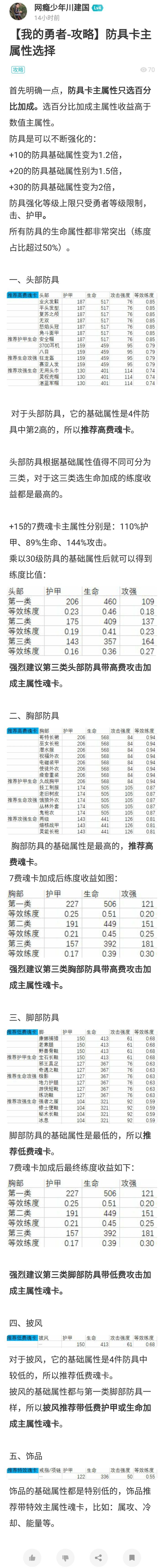 发帖60小时,各种修改等待还没过审,只好截图发。就护甲和生命的选择,先引入两个系数:生命加成系数=增加的生命/生命原值护甲加成系数=增加的护甲/(护甲原值+1500)比如你现在3500护甲,10000生命第一类头部防具魂卡加成为206护甲,460生命生命加成系数=460/10000=4.60%护甲加成系数=206/(3500+1500)=4.12%生命加成系数比较大,魂卡选生命
