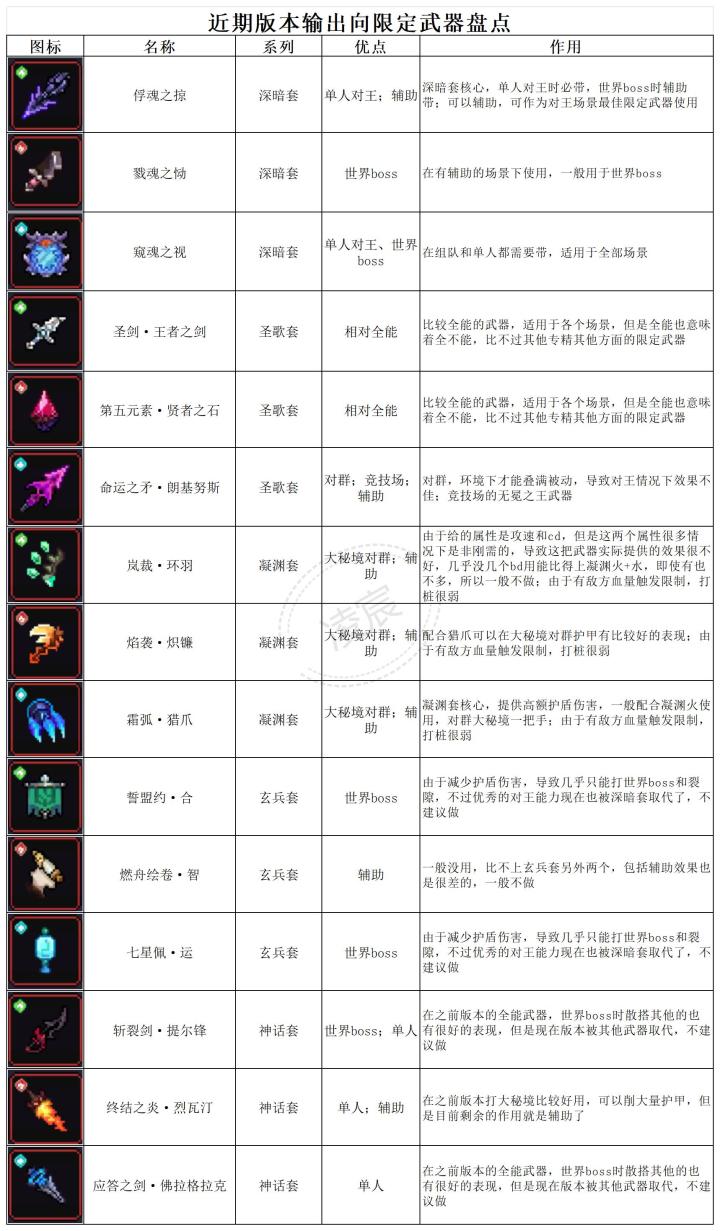 【前言】在更新修复后新限定还是有一定强度的,在大秘境对王和世界bos都优于原来的武器8-10%【武器】在单纯伤害上就有所超越,更何况提供的元素穿透和护甲穿透可以有替换掉一些属性给伤害上,所以整体提升约10%优于凝渊苍龙落木:木攻+首领+穿透俘魂之掠(刺鞭):首领+护甲穿透+暴击值/木攻+觉醒攻强/爆伤值窥魂之视(镜子):首领+护甲穿透+爆伤值+觉醒攻强/爆伤值宝石35+限定武器