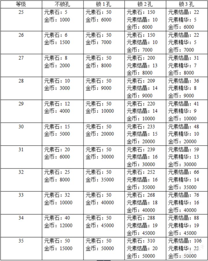 装备元素重铸消耗表:重铸建议:首先明确一点,不锁孔洗出任意系四纯色的概率是1/27,不锁孔洗出目标系四纯色的概率是1/81,锁一孔洗出目标系四纯色的概率是1/27,锁两孔洗出目标系四纯色的概率是1/9,锁三孔洗出目标系四纯色的概率是1/3,每多锁一孔,概率多三倍。下面的分析是为了使用最少的元素石,再说一遍,是使用最少的元素石!1、装备三系通用,洗出任意四纯色即可。不锁孔洗出任意系四纯色的概