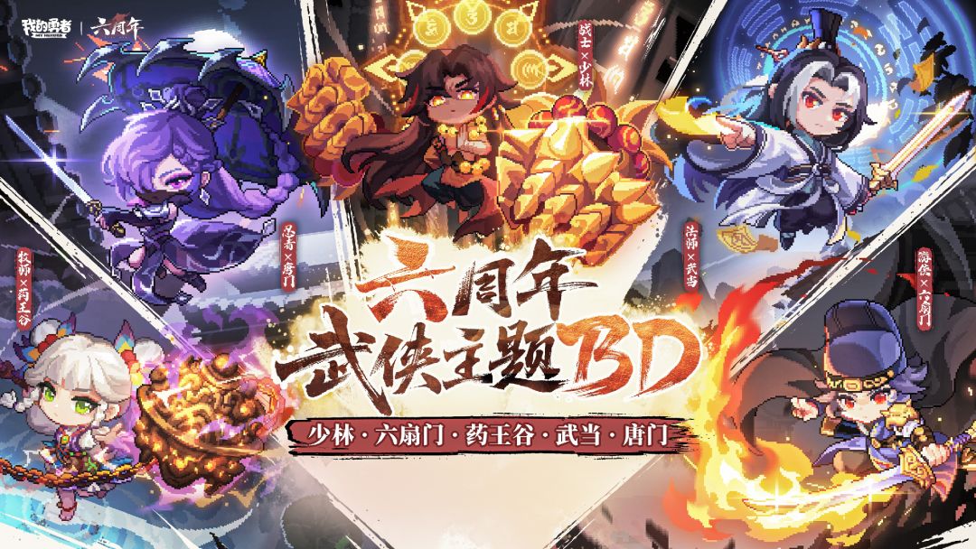 限时礼包码: 六载江湖有你在(7.31) 六周年倒计时1天 六周年倒计时2天 六周年倒计时3天 六周年倒计时4天 六周年倒计时5天(7.31) 加入门派送限定时装(7.31) 我的勇者六周年直播(7.31) 7月5日线下直播(7.31) 六周年武侠版本揭幕 (7.31) 新系统新玩法新体验(7.31) 六周年武侠BD纵横(7.31) 六周年战士BD联动(7.31) 六周年游侠BD联动(7.31)#像素刷宝