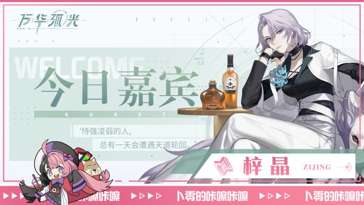 ✨校长大人~欢迎来到「咔嚓咔嚓📷」!今天的嘉宾是集武学于一身的梓晶老师~梓晶老师战斗的时候帅气又能打~但日常也有一点点迷糊呢……呀,这杯酒不是卜零的> <!卜零喝甜甜的牛奶就可以啦~还有,不可以带着酒瓶直播哇> <校长大人快来看看吧!【今日嘉宾:梓晶】未成年人不能饮酒哦~!✨Blingbling~真是愉快的一天~嗯!下一位嘉宾会是……?去哪里找到组织↓《万华弧光》预约:《万华