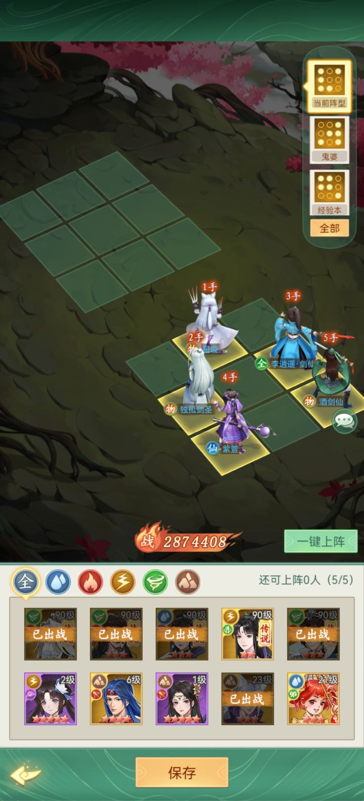 1.阵容配置:如图所示,星璇(白3)、主角、徐长卿、酒剑仙(白3)、柳梦璃2.角色功能介绍: ①星璇:白3以后可以对敌方前排提供10%的易伤效果,有助于我们更轻松的击破敌方前排怪物,降低酒剑仙的输出面板需求;另外可以对敌方前排上混乱的debuff,也有机会降低自己和柳梦璃的生存压力,为酒剑仙的输出提供有力环境。 ②主角:需要有武神(如果没有武神的话,可以通关试炼窟10层有一本免费武神),如果