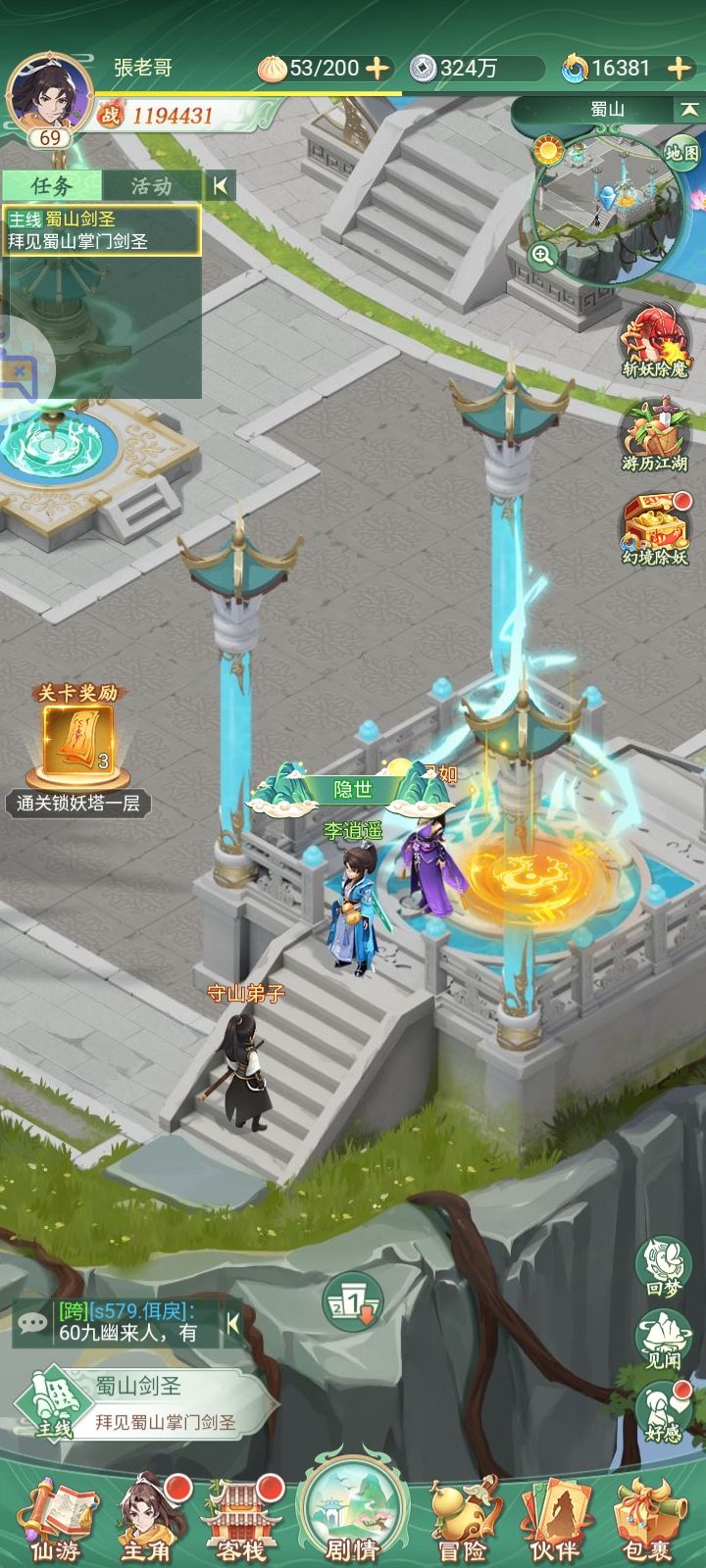 卡在这了,无法主线任务。没法去主殿,自动寻路,守山弟子就会弹出蜀山禁地,不要靠近。急,请修复。罡风95服,張老哥。