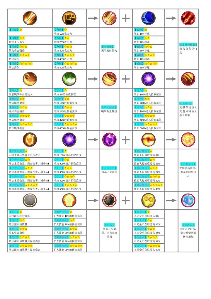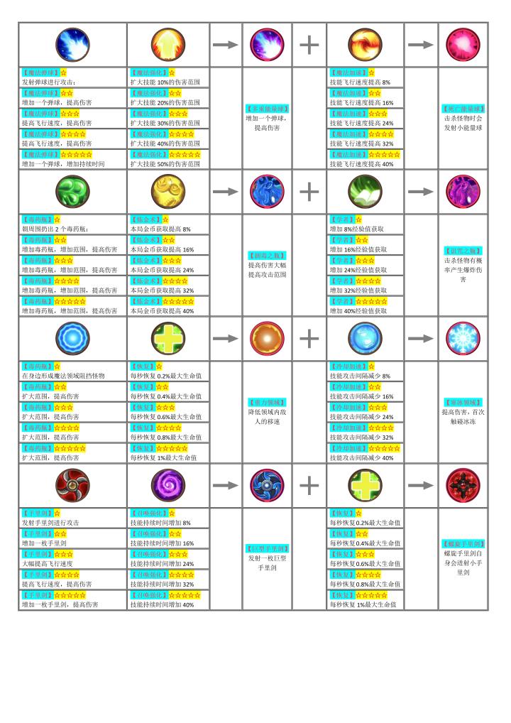 共计14组技能的等级详情和合成路径,供大家参考。1-武器推荐“弓”,其他武器,需要“瞄准”目标,才能攻击,“弓”会自动锁定目标。并且紫色合成技和红色终结技,打BOSS也比较方便。2-其他技能方面。【飓风】升级红色终结技【守护水晶】升级红色终结技【魔法弹球】升级紫色合成技【滚石】升级紫色合成技第六种技能可以考虑【魔法领域】或者【毒药瓶】之所以选择前面五种技能,主要是这几种技能升级之后