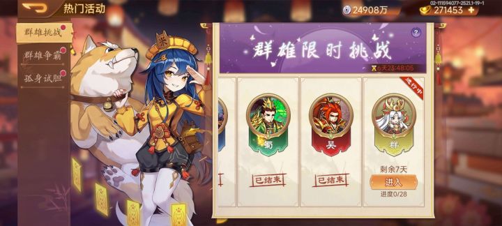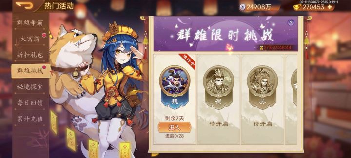 注:所有活动需更新至2.5.13及以上版本才能参加,请玩家及时更新最新版本,具体活动内容以游戏内为准。【活动1:群雄挑战】起始时间 2024-11-06 10:00:00结束时间 2024-12-13 09:50:00活动内容:活动期间开启限时副本挑战,活动副本共有7层,每层4关,每次过关可获得奖励。每日解锁一层可进行挑战。活动奖励:太史慈碎片,太史慈资石,强袭弓碎片【活动2:累计充值