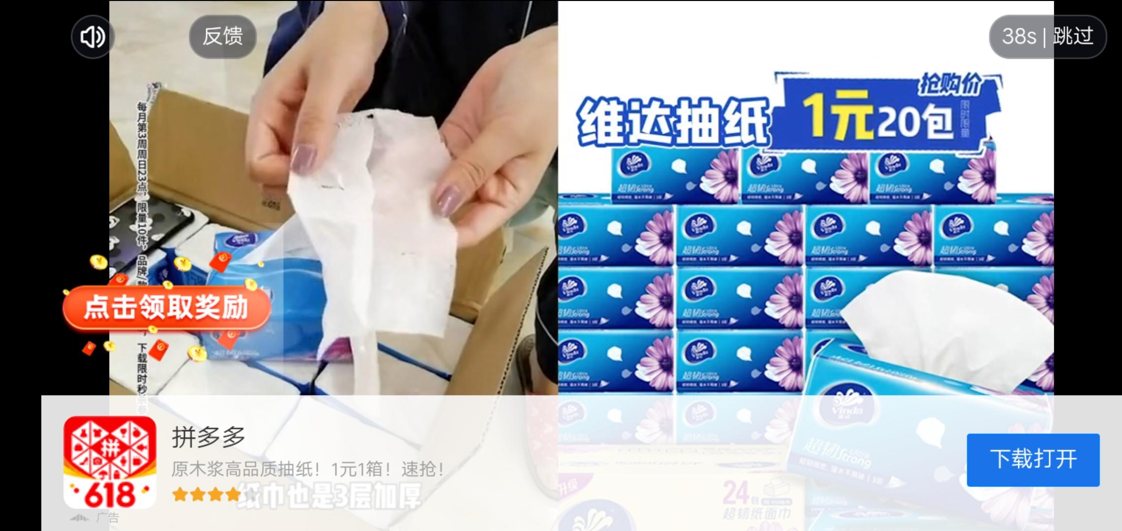 今天的广告视频全是拼多多的 ,而且都还是同一个视频 ,真的很无聊诶