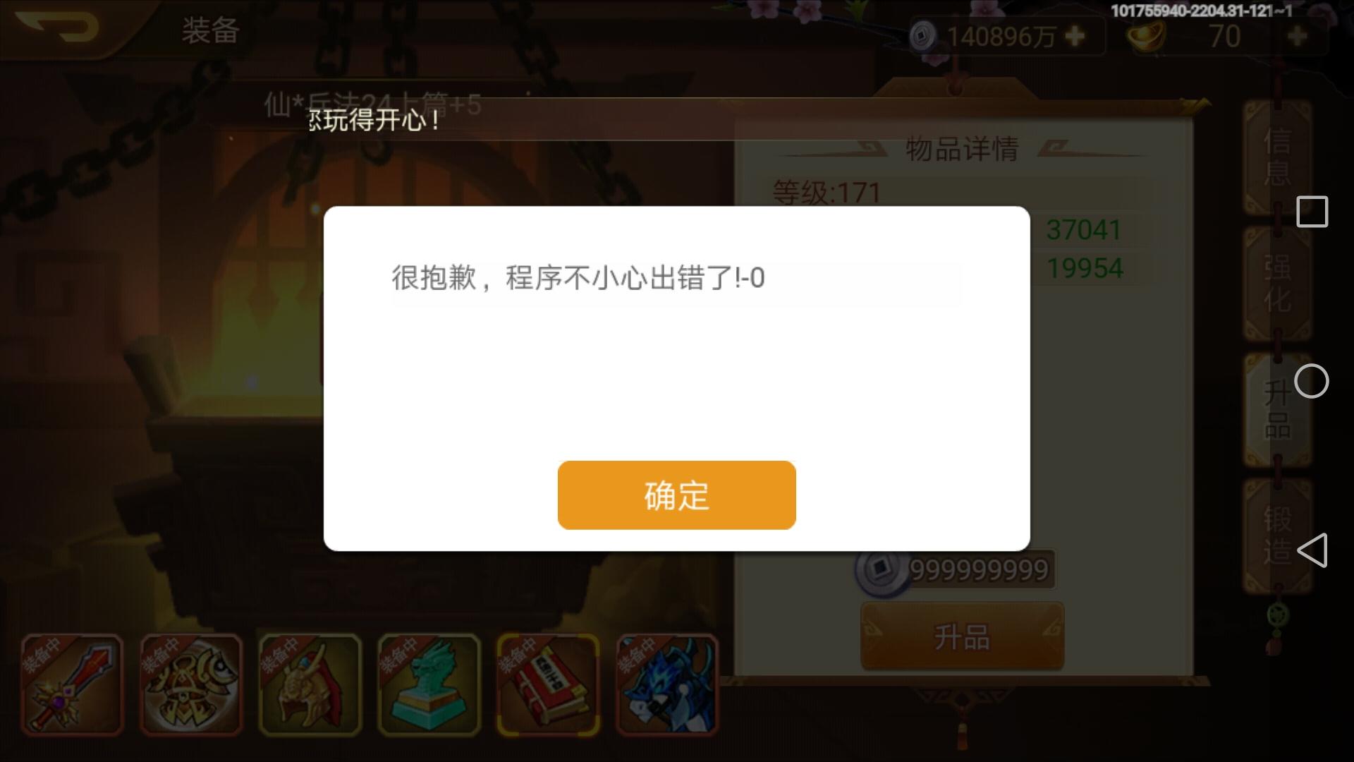 这个bug是真恶心,现在都升品不了了,找客服客服让我分解,我就想我一平民玩家分解就给一些东西,我这还是仙,对于我这个平民玩家上仙太费精力,就算更新版本也还是这样,我也是无语了,虽然我很菜但你们这客服也太敷衍了吧,我们升级装备也是很不容易的好不好,希望策划可以看到,看看能不能把这个bug给修好