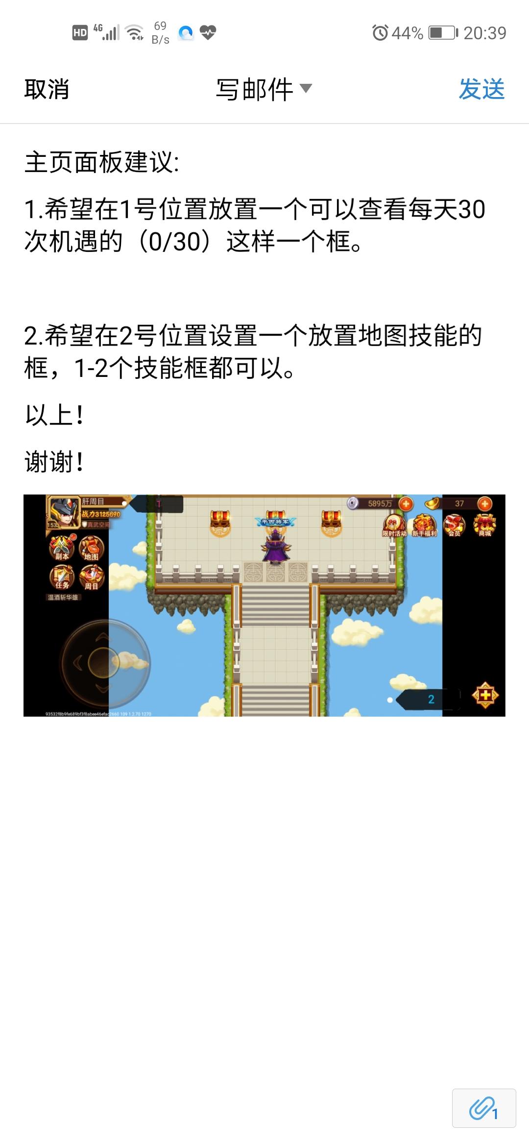 主页面板建议:1.希望在1号位置放置一个可以查看每天30次机遇的(0/30)这样一个框。2.希望在2号位置设置一个放置地图技能的框,1-2个技能框都可以。