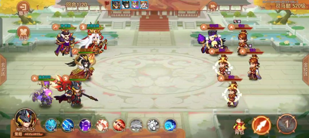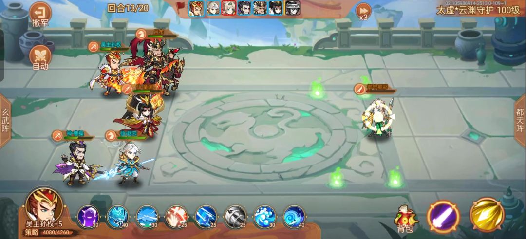 配置: 神曹,共鸣+4,3级天赋,带未启灵的琴。三星牢布,共鸣+5,带+9鞭子。童渊,带+5的剑。孙权,带印。星彩带启灵鞋子。 细节: 三个辅助放前面。牢布不能被放逐,被放逐到了直接退。有条件可以5个都超速曹丕,我是星彩开大后,童渊,曹操,孙权这三个超速。牢布尾速看情况,阵亡了就拉人,无阵亡情况的话,炮驾点月英。 我是,童渊前10回合有大点大,没大点飞镖。从第十一回合开始,奇数回合用飞镖,偶