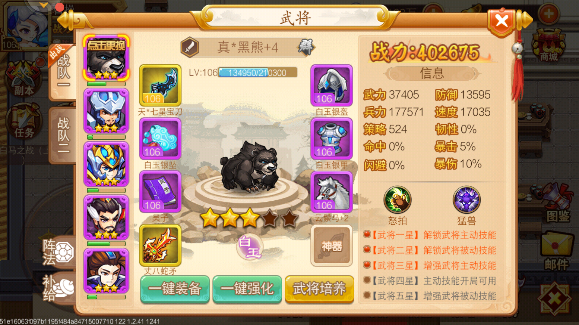 1.阵容:赵云4星,曹操5星,吕布2星,貂蝉2星(1星也可),曹仁5星。2.速度:赵云1速放大,曹操2速,后面随意,吕布尾速最好(可以吃酒)。3.阵法:我方 白马阵(30),越高当然越好 对方 我是尽量避开麒麟,八卦,白虎,背水,对面群攻将尽量不要1个以上,生存奶是第一要素。4.攻击:赵云先手放大,我方5个先手,比较好控制了,第一回合尽量都控制(曹仁放盾能顶两个攻击),第二回合吕布放大,其他