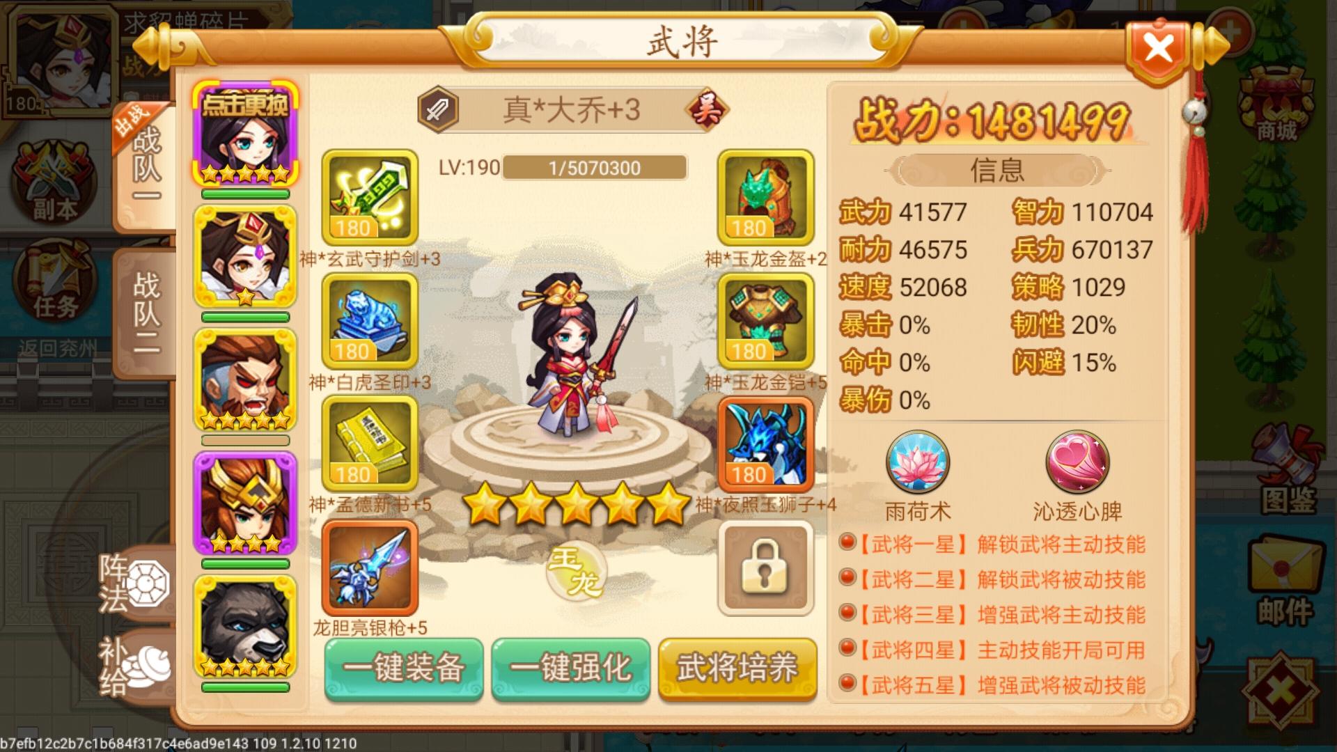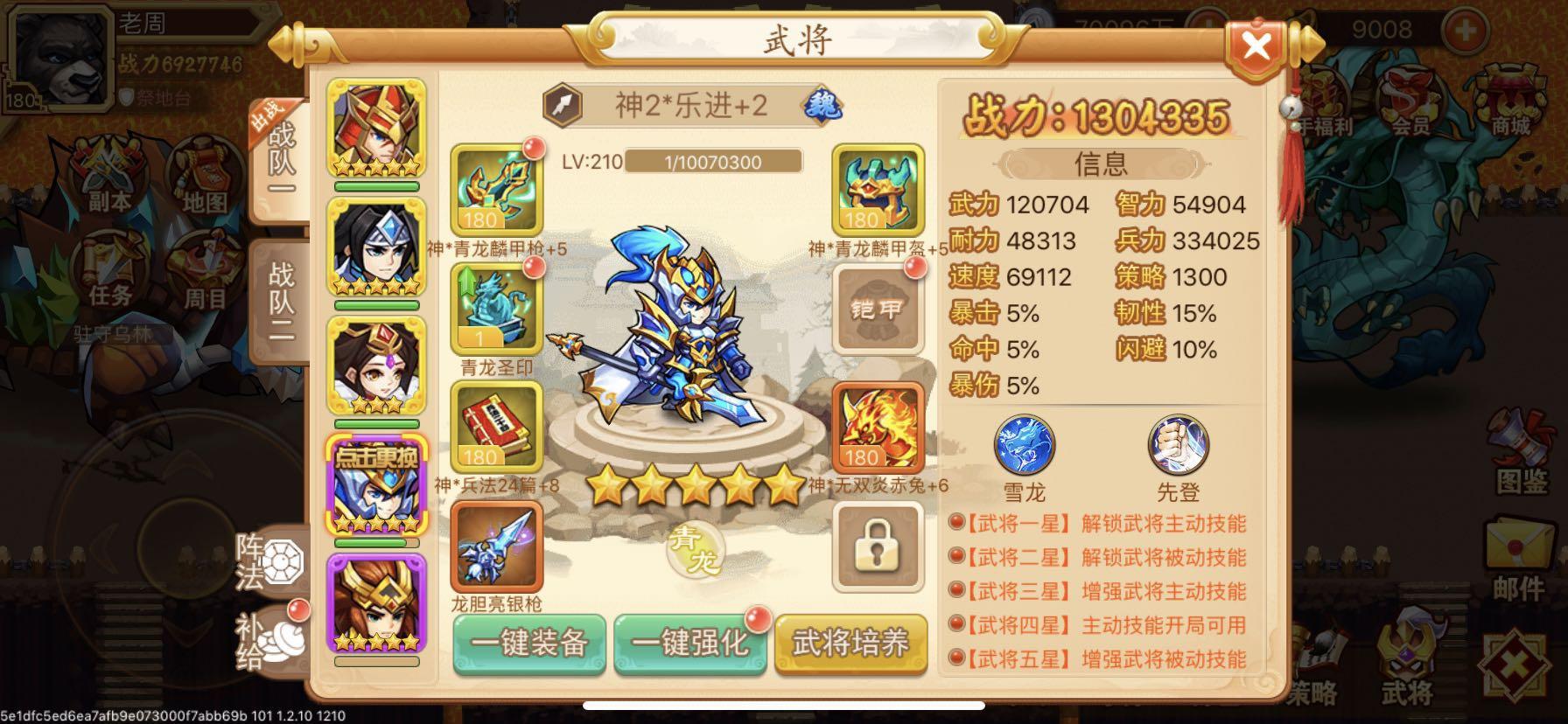 配置先上(貂蝉两星平民是可以拿到的,不要说充值才有)。配置里面我用的青龙套,平民就用玉龙套血量一样,赵云血量必须达到105万以上,貂蝉95万左右,麒麟的伤害不出暴击五星赵云105万,具体自己测试有误差,乐进必须接近7万速度,赵云貂蝉带闪避专属。周泰可以换其他武将看个人(比如五星张角增加控制,两星太史毒磨血,上周泰有个好处是可以抗一次麒麟不死,挡住小怪攻击)。入场:7万速度乐进加被动一速进