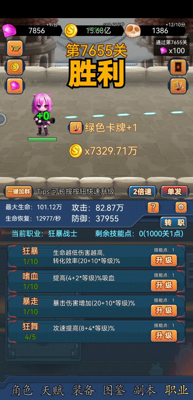 开局先看一个钻石广告(左上第三个,防止卡CD)前五十关要熬一熬 50关后先把图鉴(右上角第一个)抽了 把倍速切成1.5倍(按钮在右侧中间)到了一定关卡就去刷副本金币强化石加点:稳健流主要玩法就是攒资源(强化石和金币)看情况来进行加点:1.打小怪和boss扛得住就加攻击力(优先用金币,看情况用强化石)2.打小怪扛不住就加防御力(优先用强化石,看情况用金币)3.打boss扛不住就加生命回复(优先用