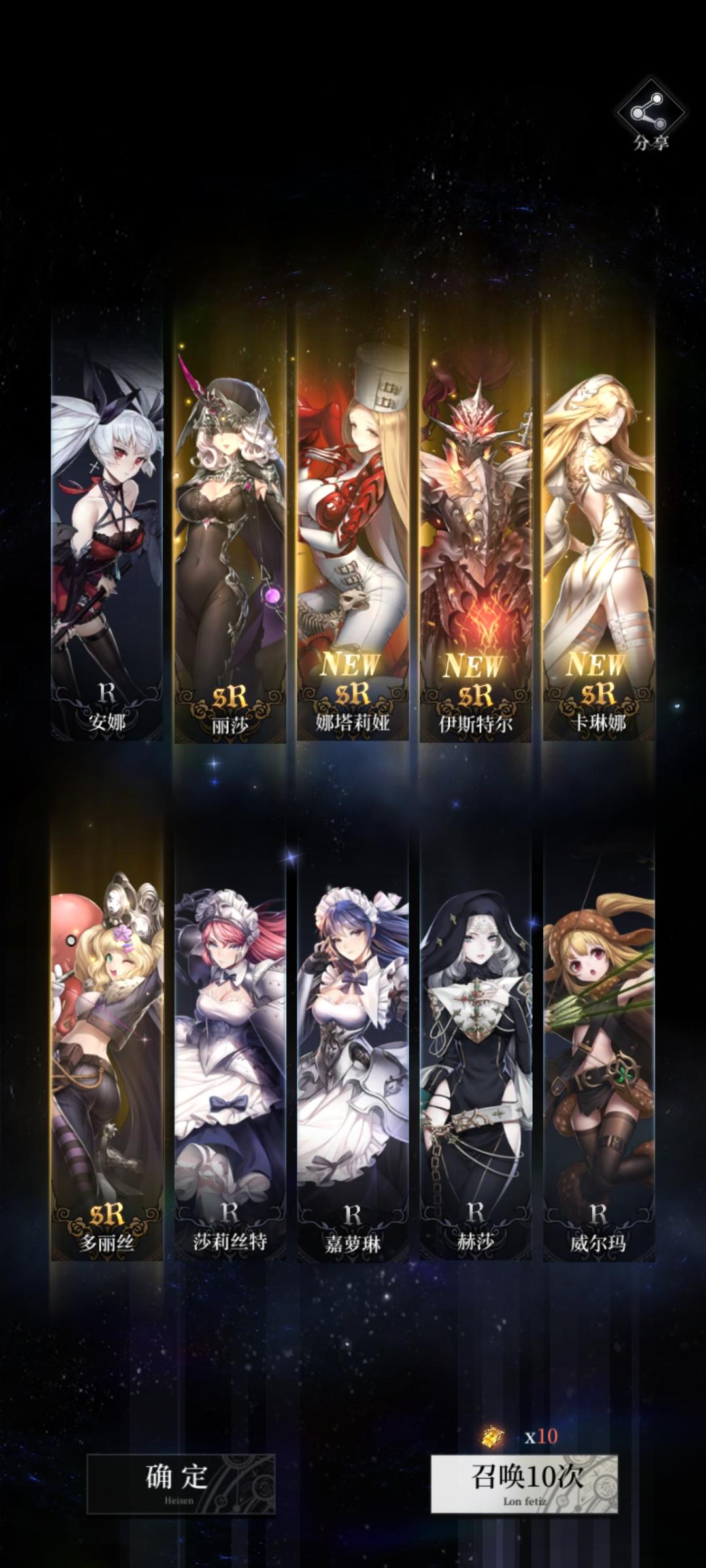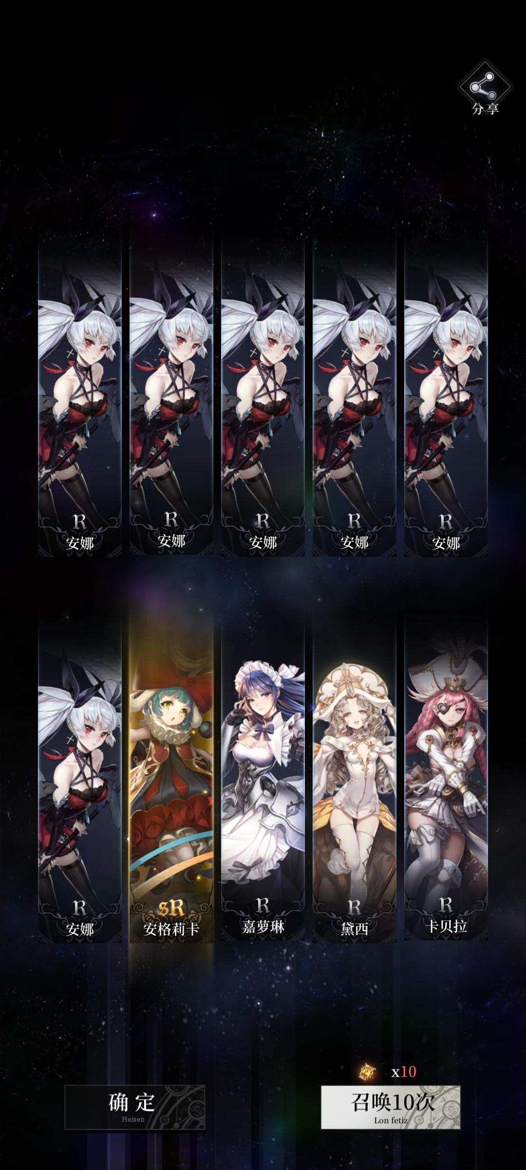 这个概率好离谱,不算无限十连一共抽了大概80抽,就第一个十连出货了,剩下的7个十连我眼睁睁看着它全是单sr保底。。。离大谱