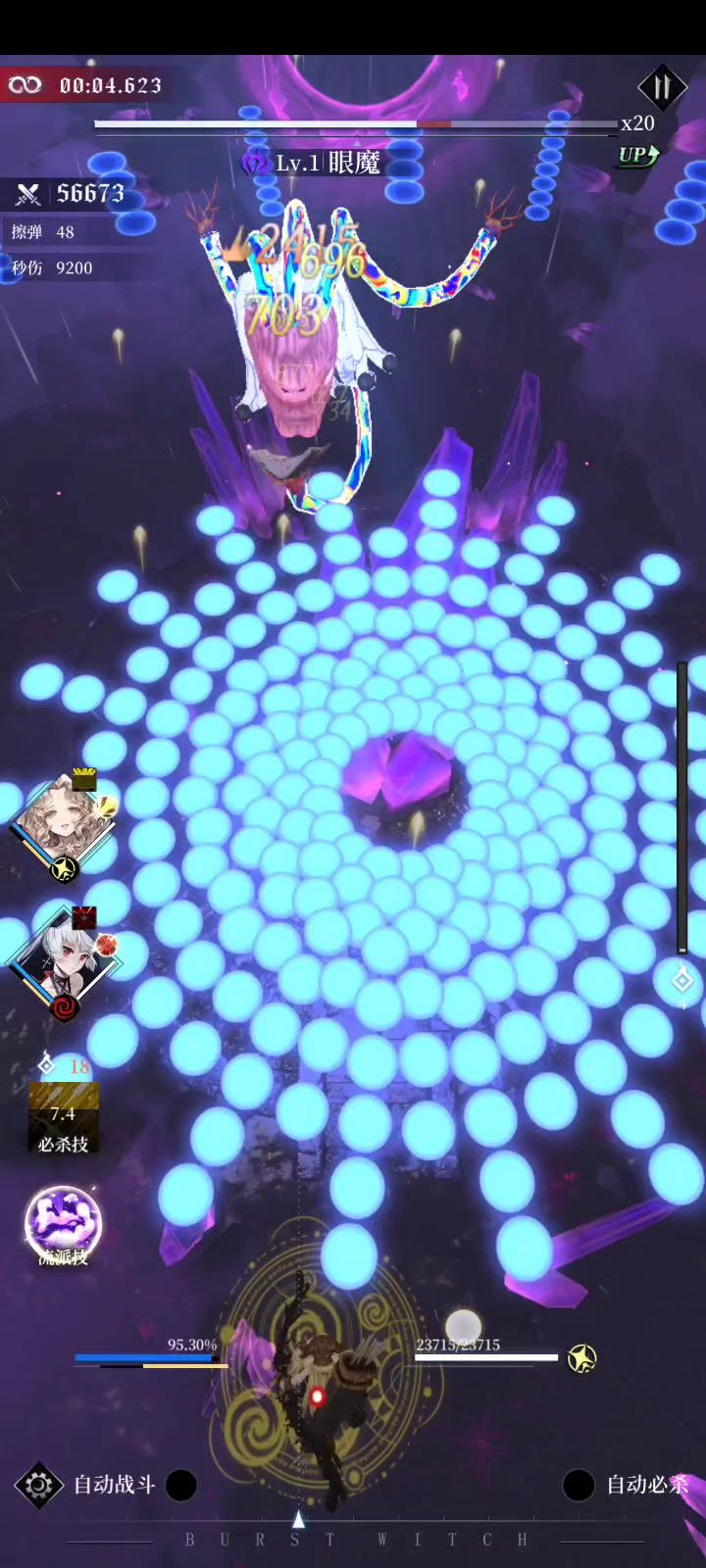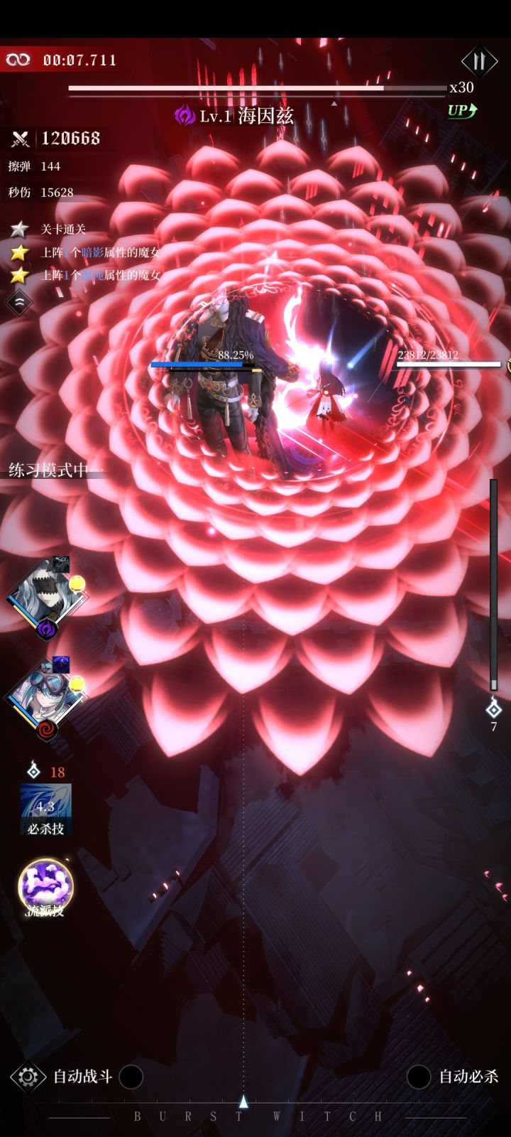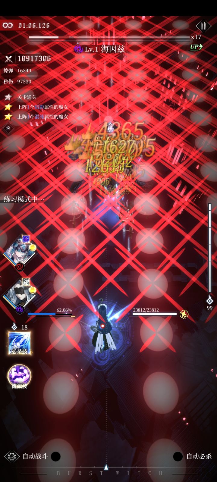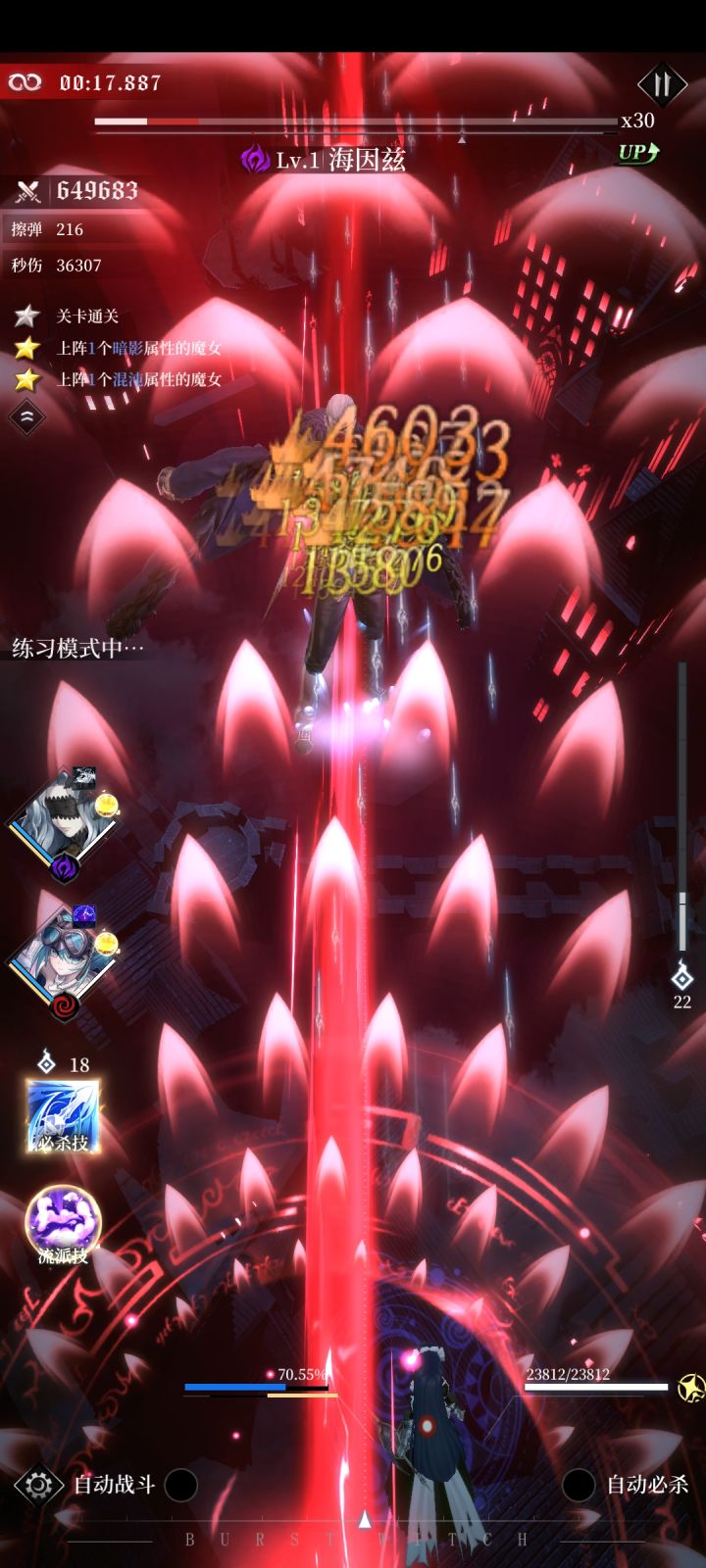 因为不知道符石或其他因素是否会对关卡产生影响,使用的是10级的安格莉卡。 15s到20s是第一波较难的地方,我的建议是先拉到左上角,再拉到左下角,最后拉到右下角,留出足够的操作空间。 25s到43s是第二波较难的地方,这个反复横跳就行,最后一波要快速从右边跳到中间,否则BOSS铺的花会把路堵死。 从45s到1m5s也不必多说,在中间方框的下方左右的固定点位反复横跳,最后移到正中间(其他地方容易被散落的飞剑打死)。 1m18s到1m19s是尾杀,BOSS是先收剑再放剑,尤其注意放剑的时候是没有预警的,而且与收剑的弹道不同,需要略微躲避。 接下来又是重复的一轮。