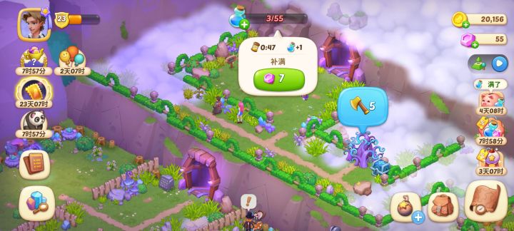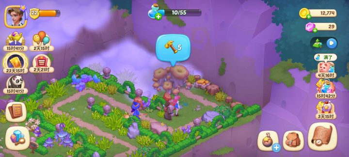 今天刷地图做到寻找水井,谁知道通往水井的路,被一大堆好像黄色的大蘑菇挡住,点击显示5个锤子才能解锁,心疼了好久终于把这个路开了,谁知道又需要5把斧头,斧头锤子是可以开活动地图体力的钥匙啊,你要了这么多,我都不想做主线地图了。