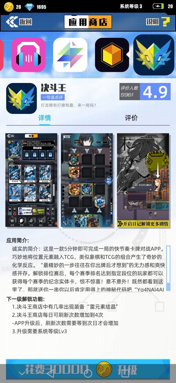 一种玩法是 地图上刷刷刷 刷经验刷食物 给龙升级好感度卸载 升级系统另一种是决斗场 玩没啥平衡没牌了就问你要不要和局的卡牌对战。反正就是刷决斗币换材料吧 给龙升级武器 进化得到实体卡。然后就是上面两种爆肝的搬砖玩家。最后是玩的莫名其妙 干脆就领了钻石抽卡 看广告每天签到签到然后 攒邮费的 真实体卡白嫖玩家。七天啥都可以不用玩,反正用钻石抽的卡都邮寄不玩,龙随便练练就行了。
