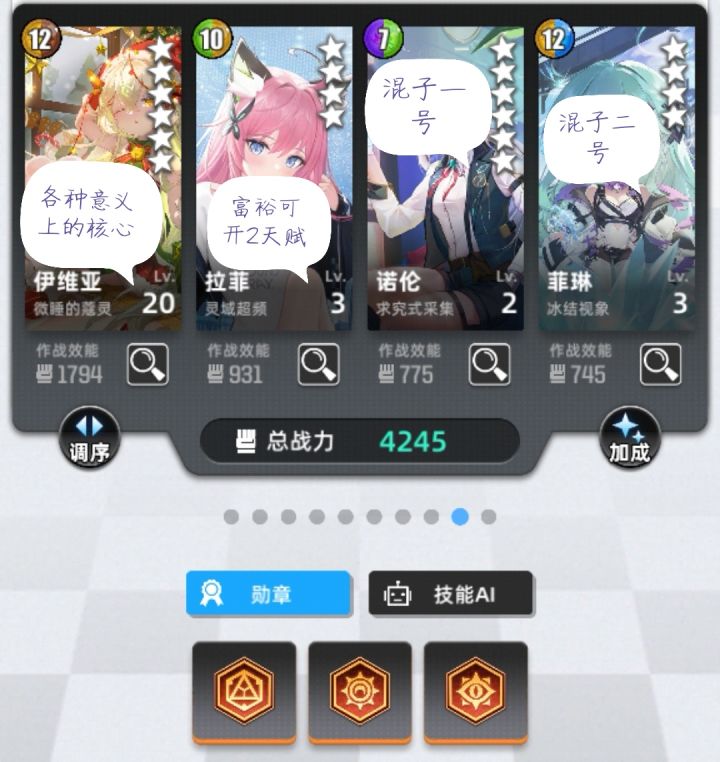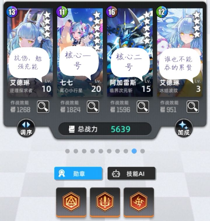 本游唯一需要手操的队伍,上限非常之高下可打日常竞技场,上可打超弦中高层本次介绍的是虚弱刀首先是队伍组成阿卡(需开天赋三挂虚弱)日炎龙(无必开天赋)堇(核心天赋3)玛格(核心天赋3)本队逻辑是阿卡首刀挂虚弱,日炎龙四消四消积累惩戒石板,堇开大满屏金刀刀死第一个,玛格天赋生效,日炎龙开大四消,积累之后堇开大接下来是超弦中层表现因为本队很容易翻车且对时机把握很重要,所以手动重要性很