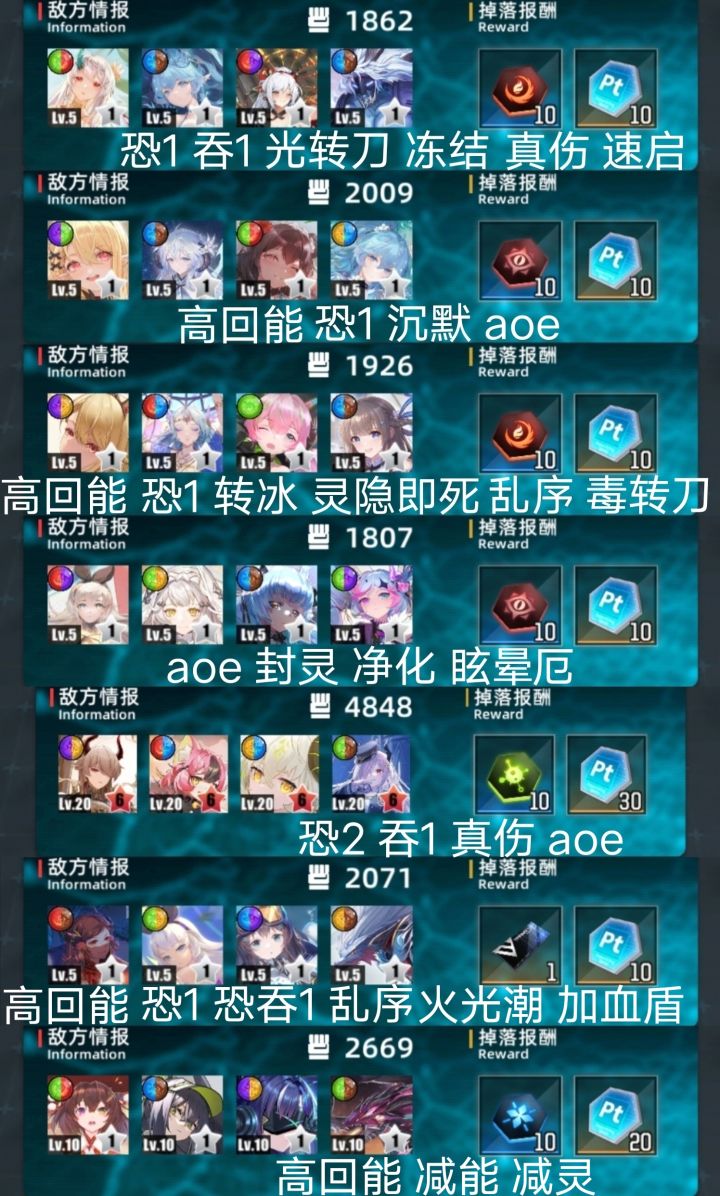 整体常规。门神较易,道中部分难。免吞较多5个。免恐11个常规。机制很多但集中。匿影灵隐一堆。真伤少,盾可用。aoe常规,刀,开门杀常规,二礼包可高层。三图。一队芙带沧波狼3421。避灵隐,四位可换沉默离玖。二队恐吞3241。三队千竹4312。避灵隐。四图。一队金币叠叠乐。只叠桃子即可,四位可吃桃子等全队灵力值打伤害,同时转刀爆发,注意开启时机。最后睡。可用人型检索人型。