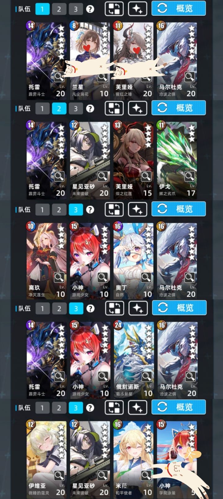 整体略难。门神较易,道中较难。免吞略多3个。免恐常规13个。机制很多,什么玩意都有,且多高回能速启。真伤少,可用盾队。aoe少,开门杀多,二礼包难高层。三图。高层。一队芙叠血4231。二位可其他回能。二队格温吞3241。四位可限制或其他回能。二队金格吞4231。手动开一位盾,或换子夜等三队菲奥队3214。二位可其他回能,四位可换四图。偏低层。一队刷钱3124。四位可换其他回能