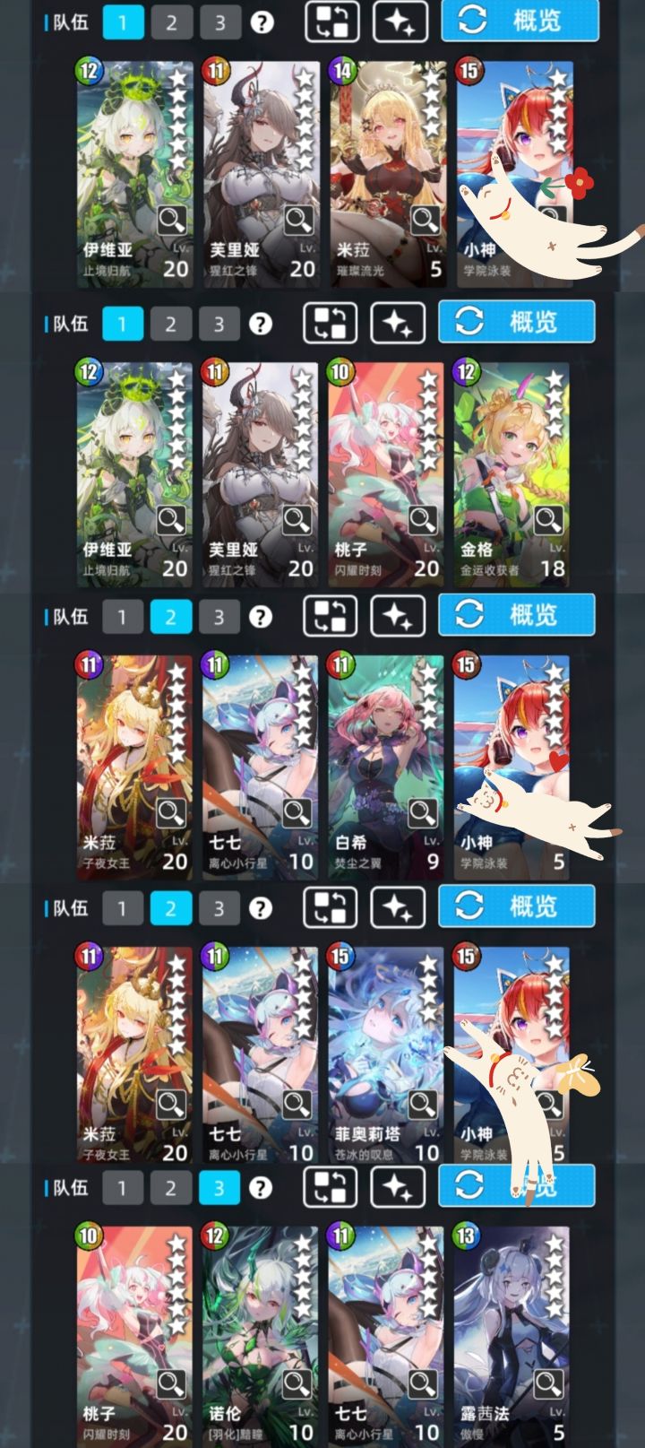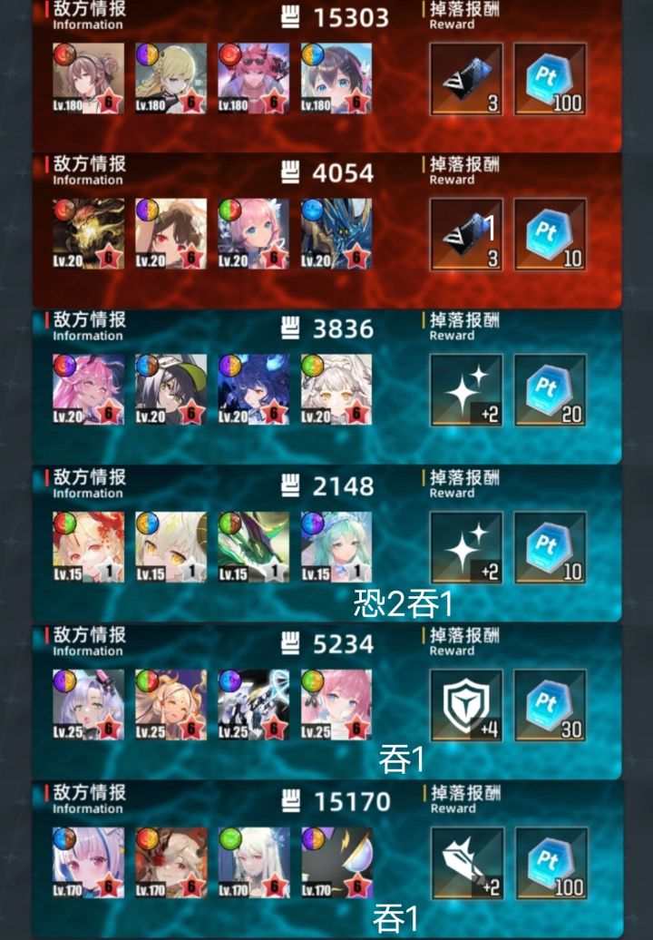 整体难度较高。门神简单。免吞较多,免恐常规量。图三。一队芙队。分为金币与高回转。二队恐吞。可纯恐吞。也可搭配苍冰菲奥收割,稳定解决残留免吞。三队金币七七。四图补个叠盾金格,充能比较麻烦。下列出可用充电宝。火毒充能难。