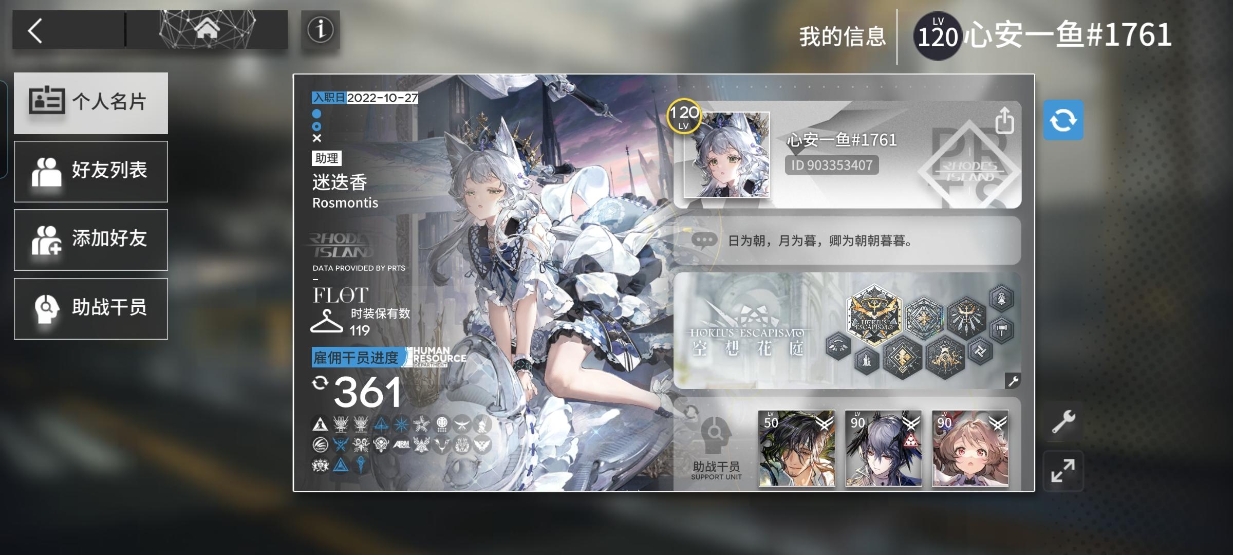 游戏名称:明日方舟 游戏当时发售平台:taptap 玩游戏的时间:大学期间推荐人群:对二次元和塔防感兴趣的玩家 正文:进大学时被舍友安利入坑一直玩到现在,通过粥认识了很多好友也结识了我的女友,可以说粥见识了我的大学生活,游戏本身也是很好的,但认识一群志同道合的人对我来说比玩游戏重要的多许愿游戏六星卡牌:代号P 冷落雪 游戏名称: 百分之一 游戏ID:清辉烈束帐号ID:1023779