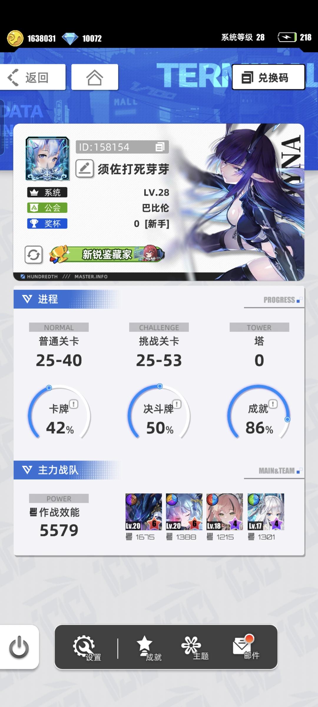 游戏名称:百分之一 发售平台:TapTap 游戏时间:闲暇时间 推荐人群:消除,抽卡,养成,养眼,组卡,配队,爽玩 游戏体验:爽就完了,一顿消除,对面销失许愿六星卡牌:代号s*妮娅游戏名称 :爱丿苗 账号ID:1021062