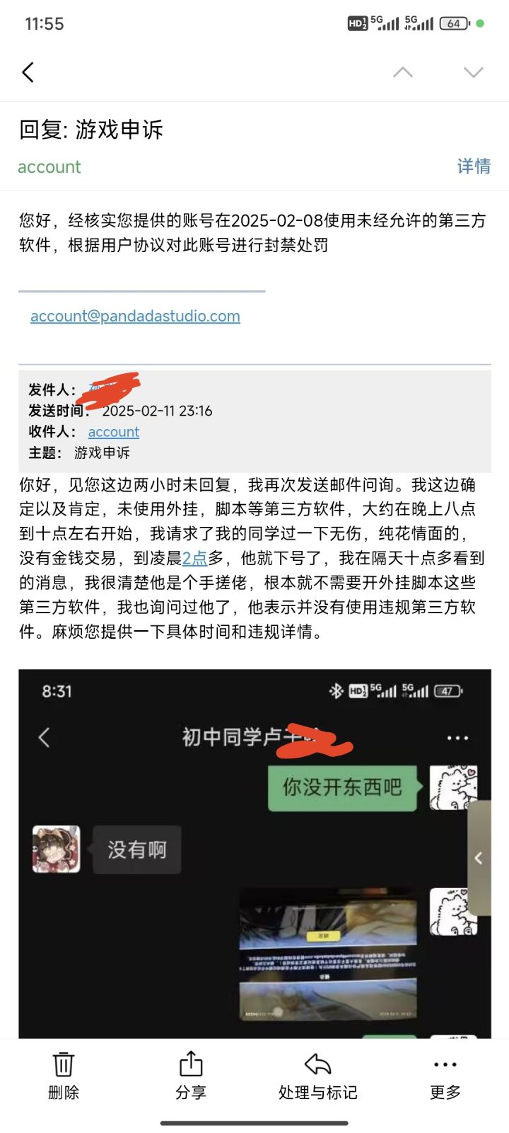 昨天十一号下午,我登录忍三的时候发现账号被封禁了,后续我发送邮件去查询邮体的原因,反馈给我的是说我使用了第三方的软件,就是外挂脚本这些的,但是我就是一个普通玩家,我连脚本都没挂过,更别提开外挂。我根据反馈的时间进行核对,发现是在八号的晚边时候,我找了一位会打神行的同学,请求他帮我打了一下神行三,然后我在群友的建议下去找到了他,询问他是否有在上我号的期间使用过外挂或者脚本这些第三方违规软件,得到了,