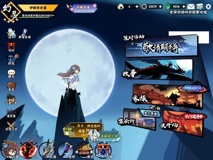 老宋你妈又叫你回家吃饭了。祝你和阿姨新年快乐吧。咱啥时候能打游戏啊。啥也点不了,氪金都不让了。为了回家,钱都不赚了是吧。