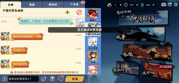 真是天元大舞台,有妈你就来!我寻思我私聊也没骂你啊,为啥跑图死了还能理直气壮,忍界变成小学生的天下了吗?我看你都绝忍了不应该是这样的素质吧???难道被女朋友绿了?不得不让我浮想联翩!准备对线呢,好家伙直接来个拉黑。回看了一遍录像,确实复活了,p1跑图没走两步掉坑了。谁没有个老寒腿的时候?你说你复活了不就行了。发出来给大家做个提醒,私聊了别人直接屏蔽,别像我一样当了大冤种!!!