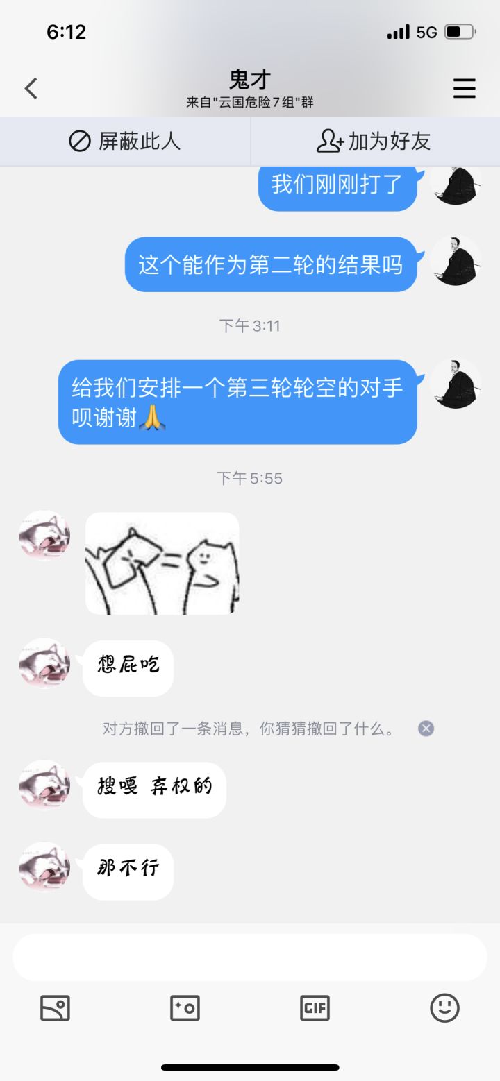挂一下小白的裁判对待人的态度,以及判决比赛的不认真,比赛第二天晚上七点结束,我们是下午去打的,在我们打之前就给我们算双方弃权,他说昨天九点就结束了(所有难度的比赛时间相同)。这就搞得没框了,这是把玩家当人看的吗?