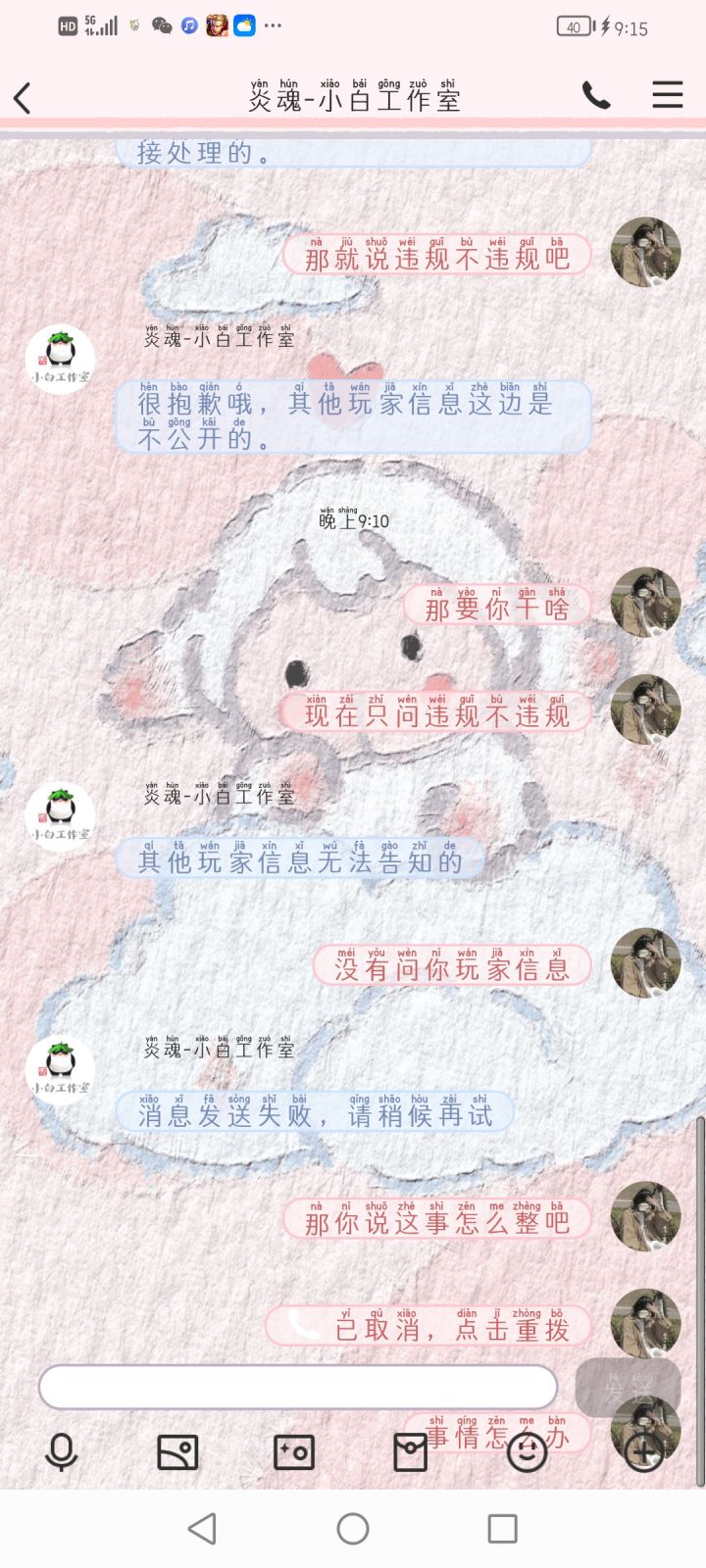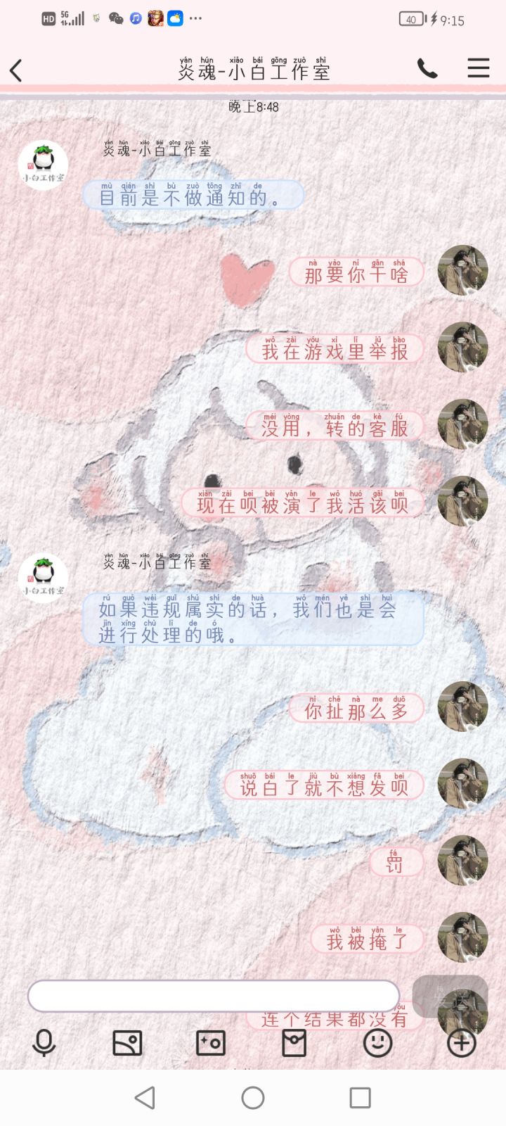 两个队友都是修罗,一个队友不灭掉坑暴毙可以理解,另一个怎么说,我举报不成功,转人工客服,我只是想要一个结果,你哪怕不扣分,我就想知道违规没有,我不明白现在这个游戏的意义在哪里,客服根本不管,我从头到尾只要一个说法,先是说受理不会通知,后来我只问这样违规不违规,真的不明白,我只想要一个公平......累了,真的.